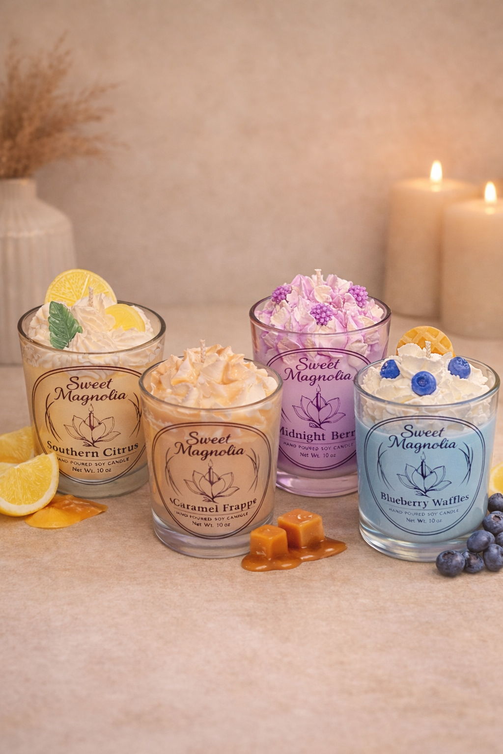 At Sweet Magnolia Candles, every candle is hand-poured in small batches using premium soy wax and high-quality fragrance oils.